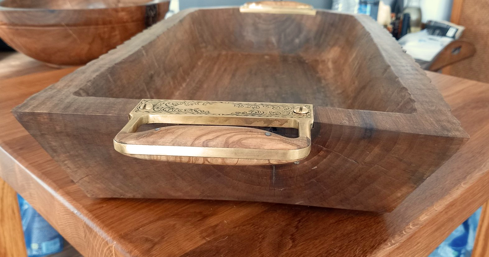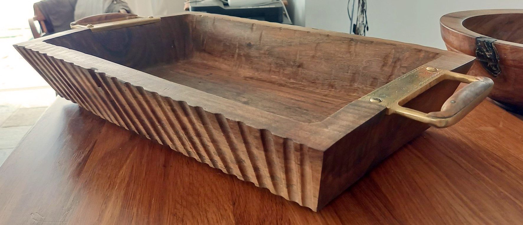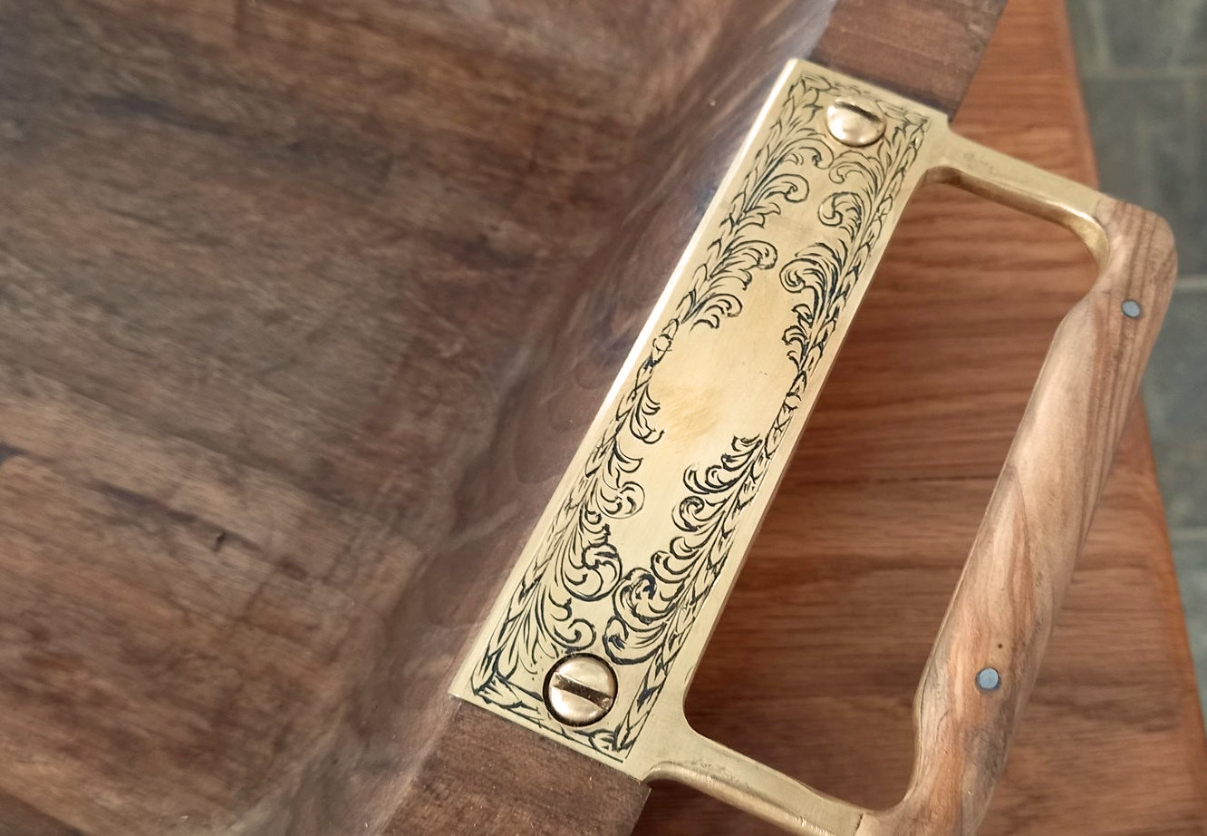 Below, a walnut tray with solid brass handles which we engraved and embellished with olive wood scales.