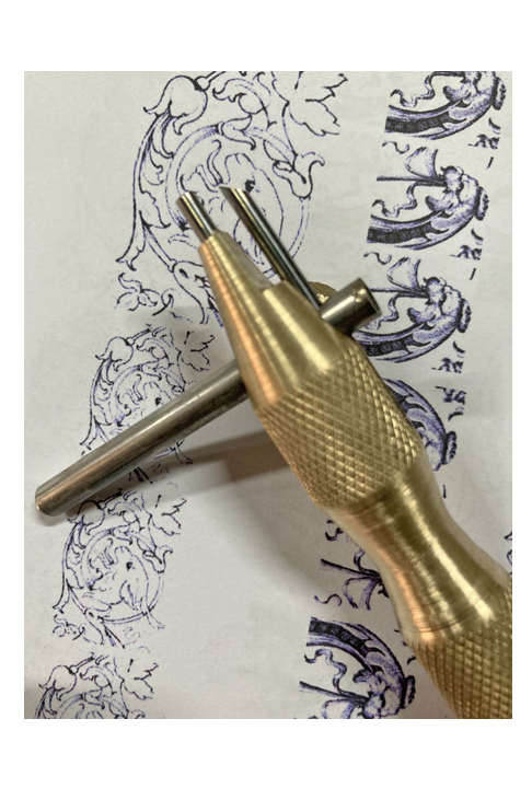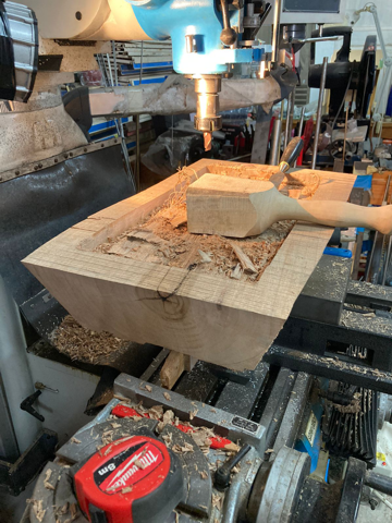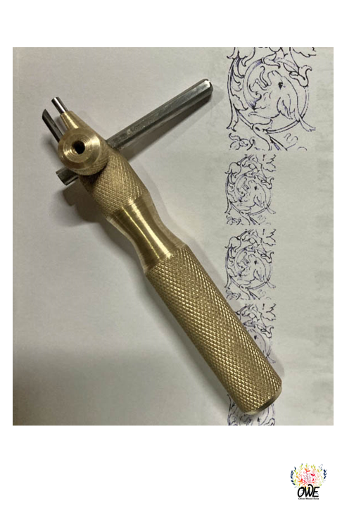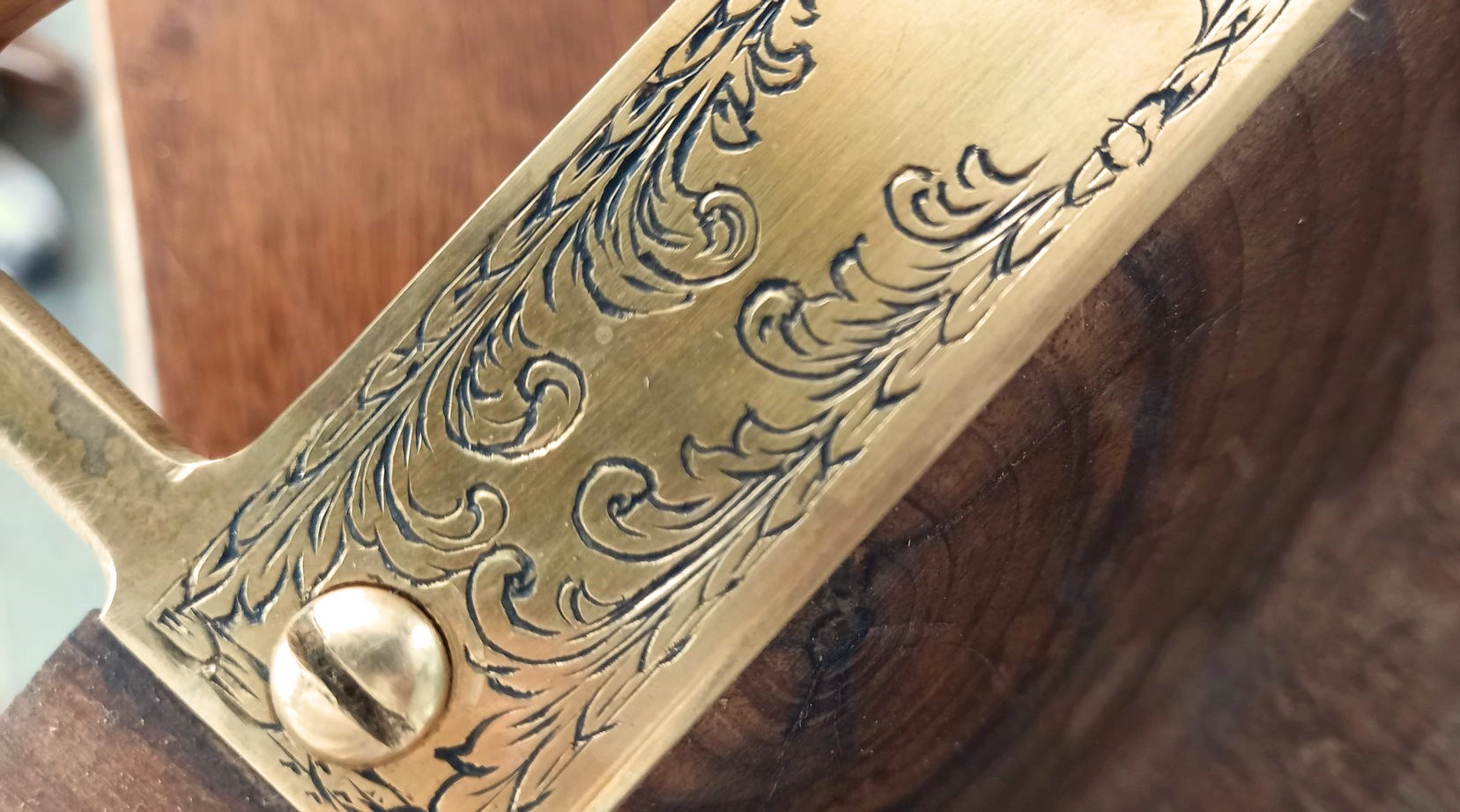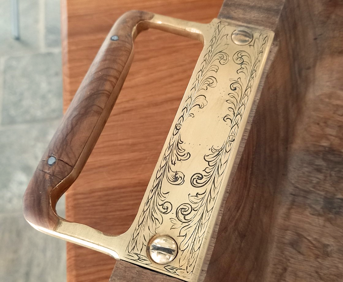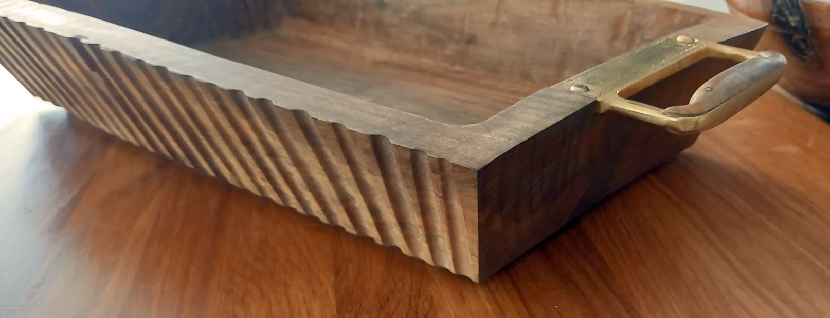 Below, a walnut tray with solid brass handles which we engraved and embellished with olive wood scales.